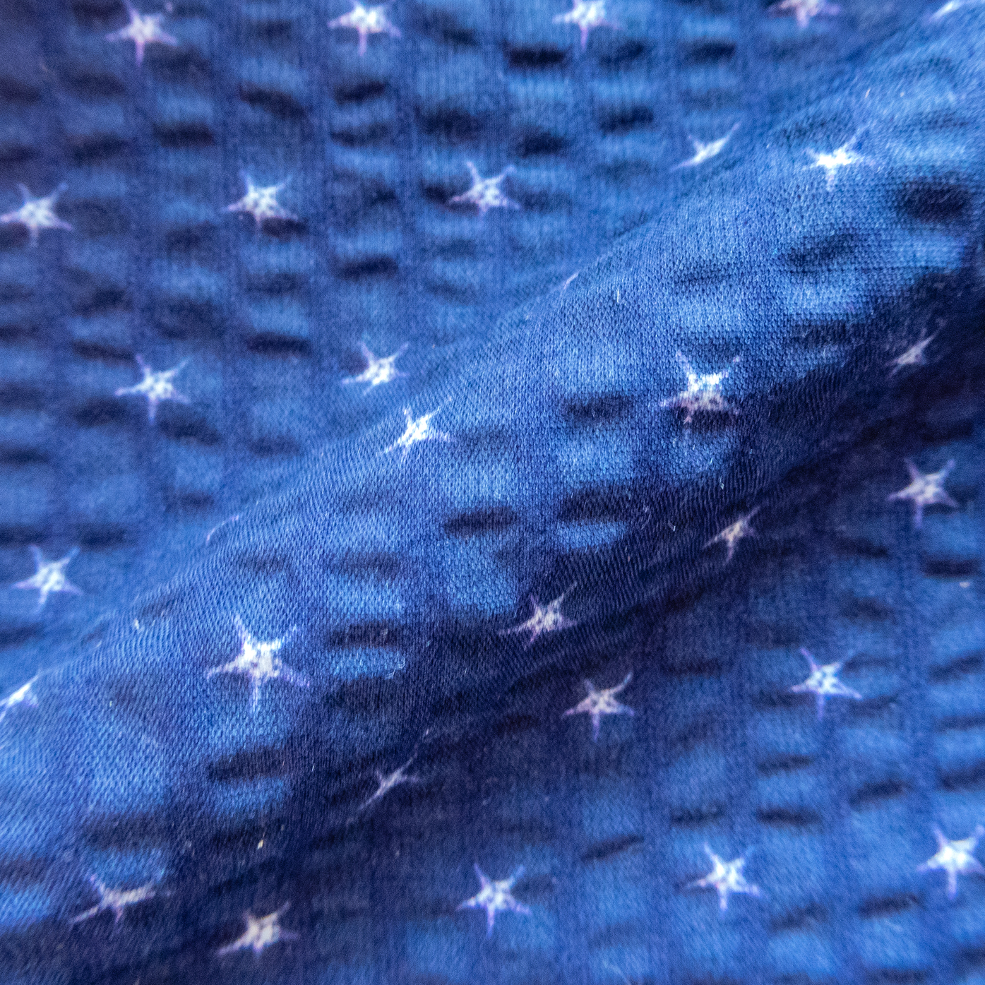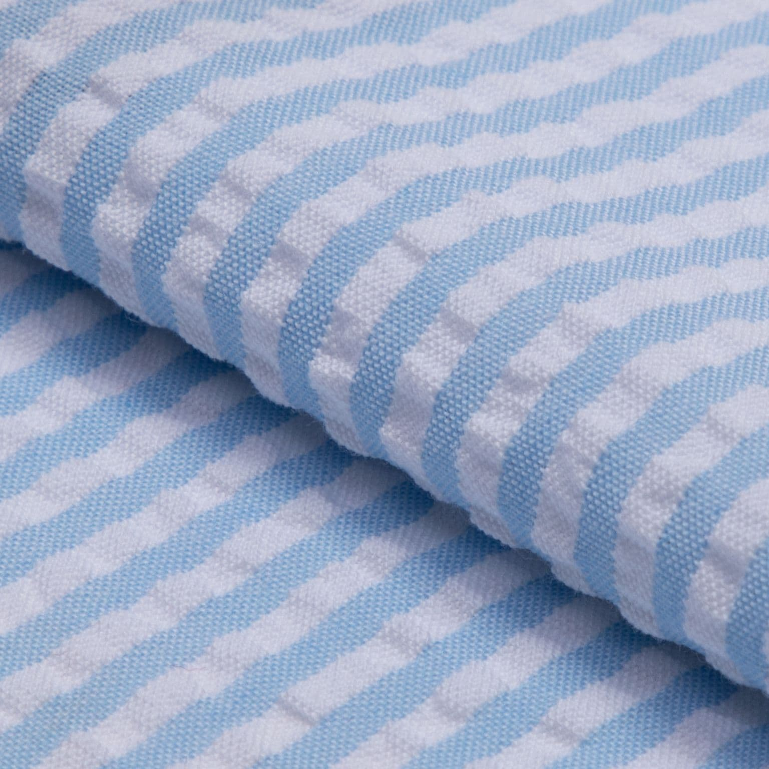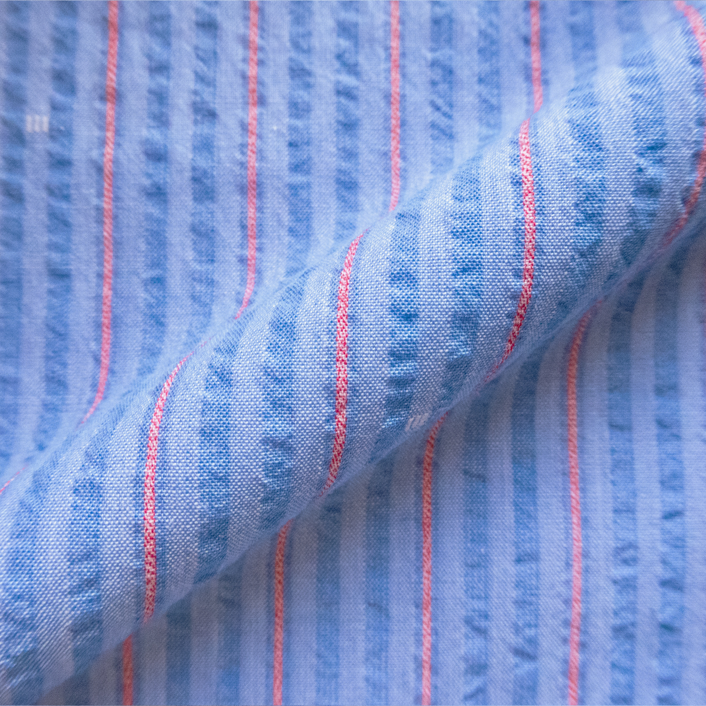 Seersucker is a lightweight cotton fabric distinguished by its puckered texture and breezy comfort. Created through an alternating tension weave, it produces a crinkled surface that lifts slightly from the skin, allowing air to circulate freely.